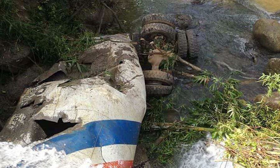 Khi nhấc lên khỏi đường thủy, xe bồn bị biến dạng, toàn bộ khung bị biến dạng và thùng nhiên liệu phía sau cũng bị thủng và vỡ. Chiếc xe khách bị nghiền nát hoàn toàn đã phá vỡ kính chắn gió phía trước.