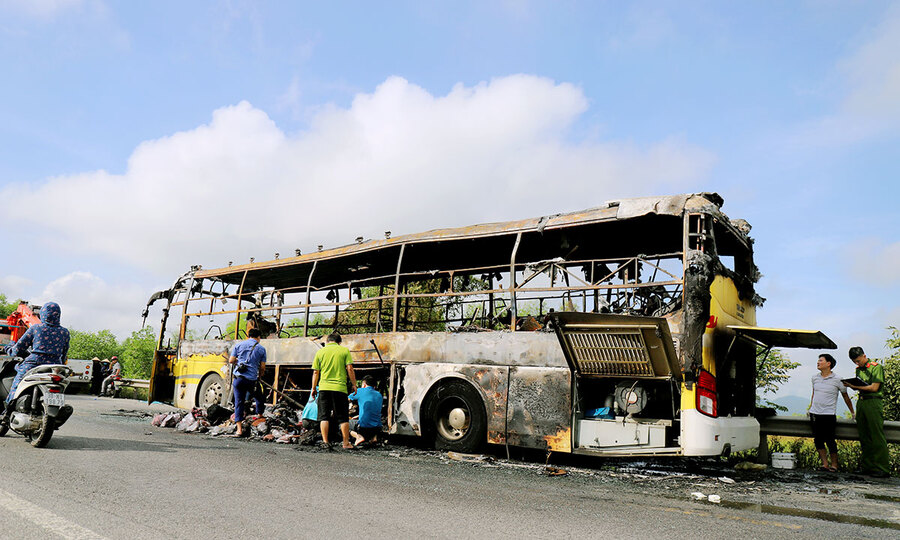 30 phút sau, ngọn lửa được dập tắt nhưng chiếc xe khách giường nằm bốc cháy ngùn ngụt, hành lý, đồ đạc của hành khách được đưa vào khoang và gầm xe.