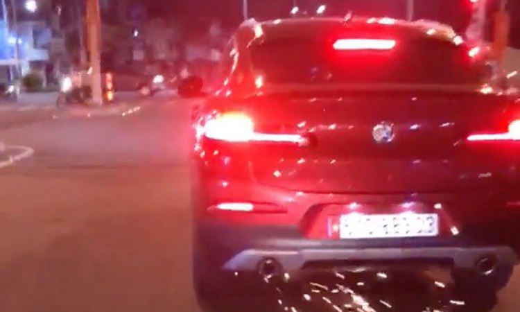 BMW kéo lê chiếc xe máy và bốc cháy trên đường dẫn đến chỗ rò rỉ. Ảnh: Video quay lại nhân sự.