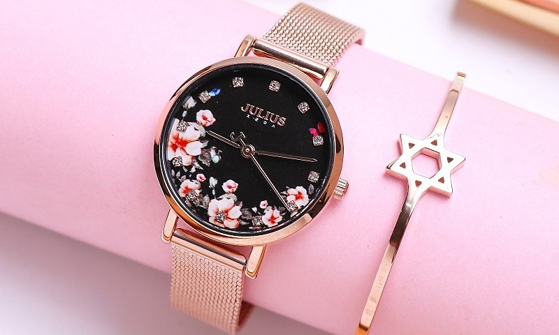 Đồng hồ nữ dây da Julius Hàn Quốc JA-844E có vỏ làm bằng hợp kim thép không gỉ. ‘thép không gỉ. Dây đeo bằng da tổng hợp mềm mại có thể hạn chế tối đa các vết nứt sau thời gian dài sử dụng. Mặt số nữ tính với các vạch số hình trái tim. Mặt kính cường lực có đường kính 35mm chống xước tương đối, chống va đập tốt. Giá của sản phẩm là 720.000đ, giảm 22% so với giá gốc. – Đồng hồ nữ Julius Hàn Quốc JA-959C giảm giá 30% so với 792.000 đồng (giá gốc 1,123 tỷ đồng). Kính khoáng trong suốt, độ cứng cao, lăng kính 3D có khả năng chống rung hàng ngày rất tốt, có thể mang đến những hiệu ứng đẹp mắt. Đường kính mặt 30mm, phù hợp với cổ tay nhỏ. Dây đeo và vỏ được làm bằng hợp kim thép không gỉ mạ vàng hồng sang trọng.