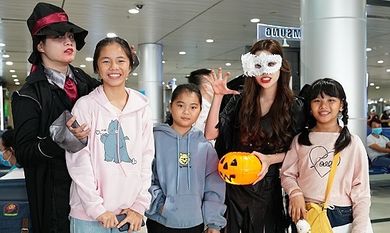 Tại khu vực lên máy bay, đoàn lên máy bay hóa trang sặc sỡ đậm chất Halloween khiến hành khách vô cùng ngạc nhiên.