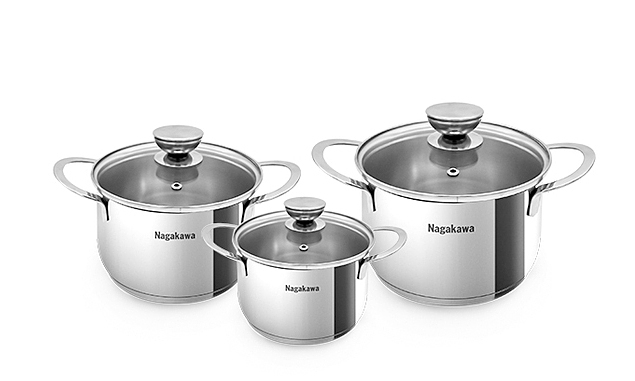 Bộ 3 nồi inox Changhe NAG1304, kích thước 4 đế là 16 cm, 20 cm và 24 cm. Kiểu dáng nồi thẳng đơn giản. Lòng nồi bằng kính cường lực dễ nhìn thức ăn, lòng nồi bằng thép không gỉ. Đáy làm 4 lớp có khả năng tản nhiệt, hấp thụ nhiệt và giữ nhiệt tốt, dùng được cho bếp từ, bếp gas, nồi cơm điện … bộ sản phẩm giảm 30% chỉ còn 359.000 đồng. Đường kính của bể ba khúc Changhe NAG1351 lần lượt là 16cm, 20cm và 24cm. Thân nồi bằng inox 304, tay cầm inox, nắp kính cường lực, đai ốc inox chịu nhiệt. Cấu tạo đáy 5 lớp giúp nấu chín đều và giữ nhiệt lâu. Đế nhiễm từ dùng được cho mọi loại bếp. Ngoài tặng kèm bộ nồi Changhe đường kính 20cm, bộ sản phẩm được giảm 25% còn 1,19 triệu đồng.