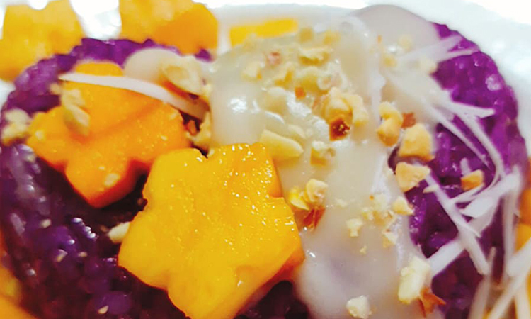 b. Cách pha nước cốt dừa: Hòa phần nước cốt dừa còn lại với một ít nước và đường (tùy theo khẩu vị của gia đình), cho vài lá dứa vào nồi, đun nhỏ lửa. Vừa nấu vừa khuấy đều cho đến khi hỗn hợp đặc lại thì tắt bếp, vớt lá dứa ra, để nguội. Xoài chín gọt vỏ, cắt hình tùy thích. Cắt hoa theo khuôn hoặc theo sở thích của bạn. d. Giới thiệu: Cho xôi ra đĩa, xếp xoài, rưới nước cốt dừa vào trộn đều, rắc đậu phộng (lạc) rang nhẹ hoặc vừng (mè), dừa nạo lên trên và hương vị. — Nước Bùi
